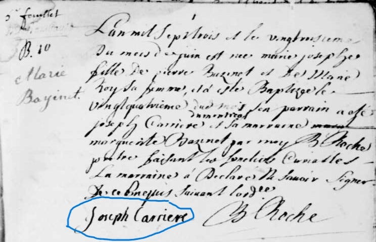 French Noël’s dad Joseph Carriere (b. 1682, Montreal) had good penmanship. You can see it in his signature when he witnessed baptisms in Montreal. Maybe not the most interesting fact, but it probably means he was literate.